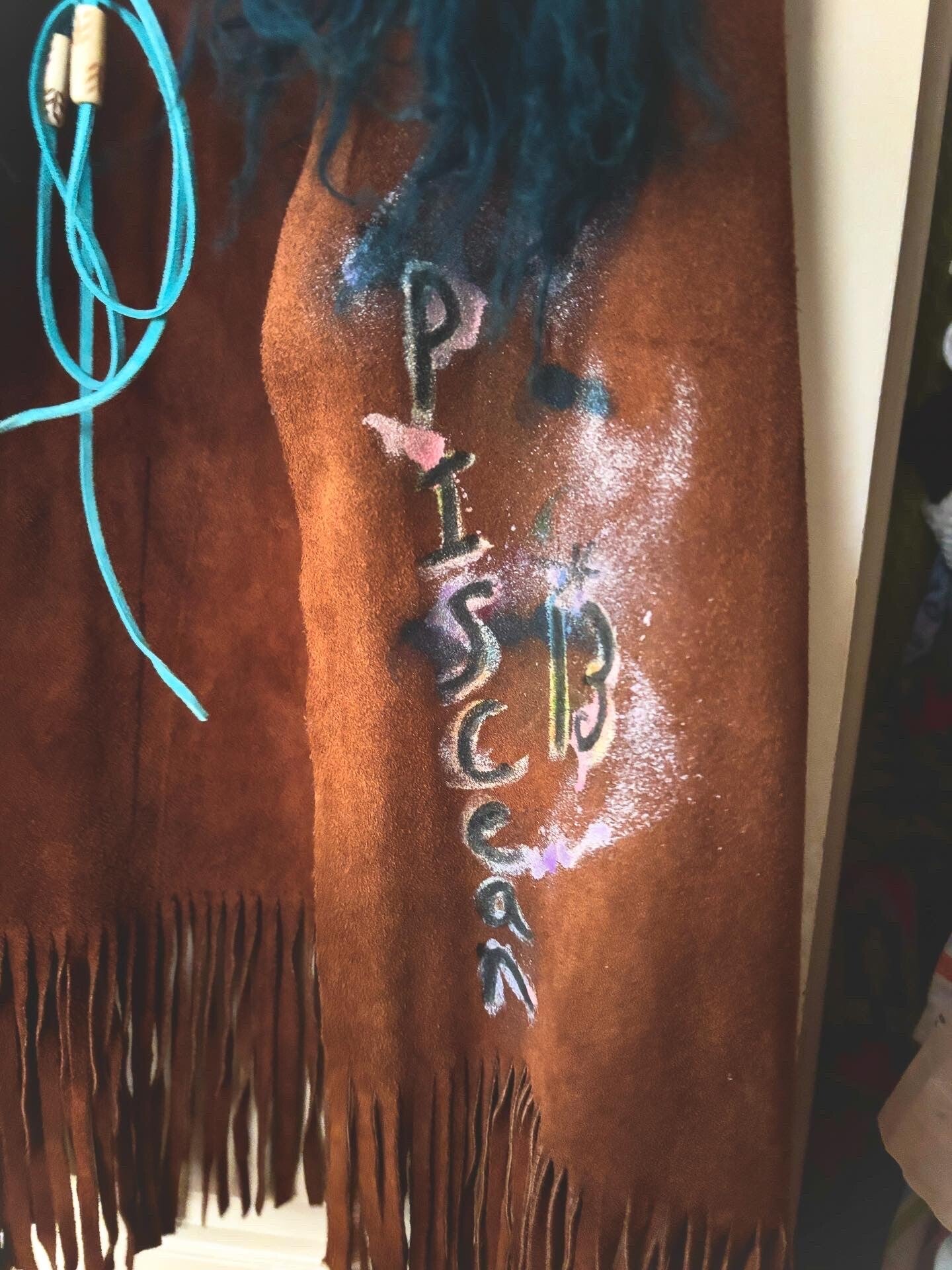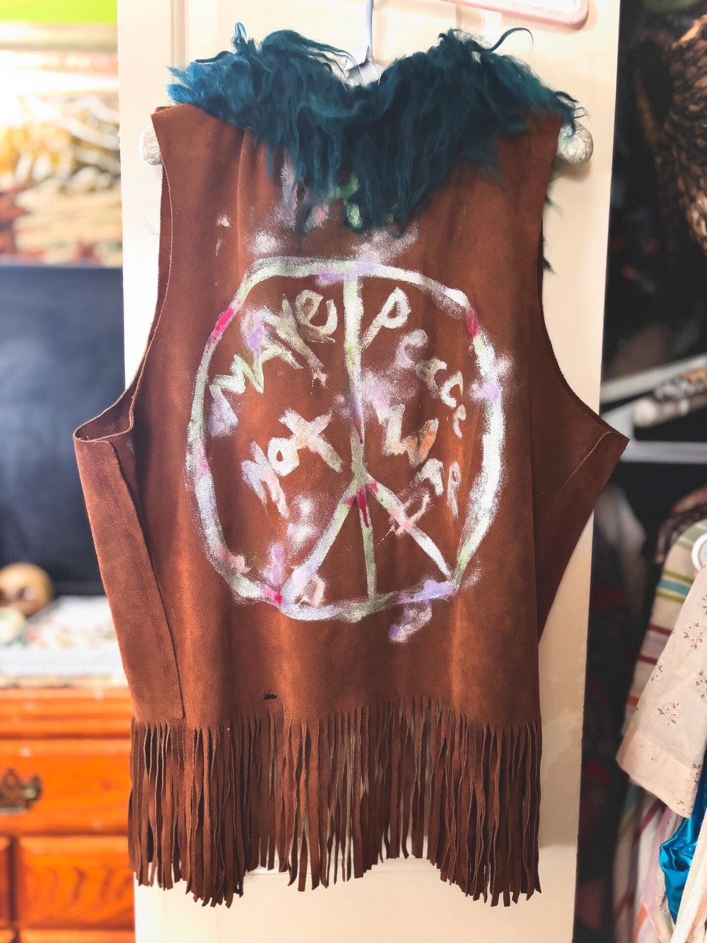 Fringe Suede Hippie Vest: Handmade hand painted up-cycled fringe suede leather vest with sheepskin fur bone beads and more. Size: one size fits most S, M, L, XL