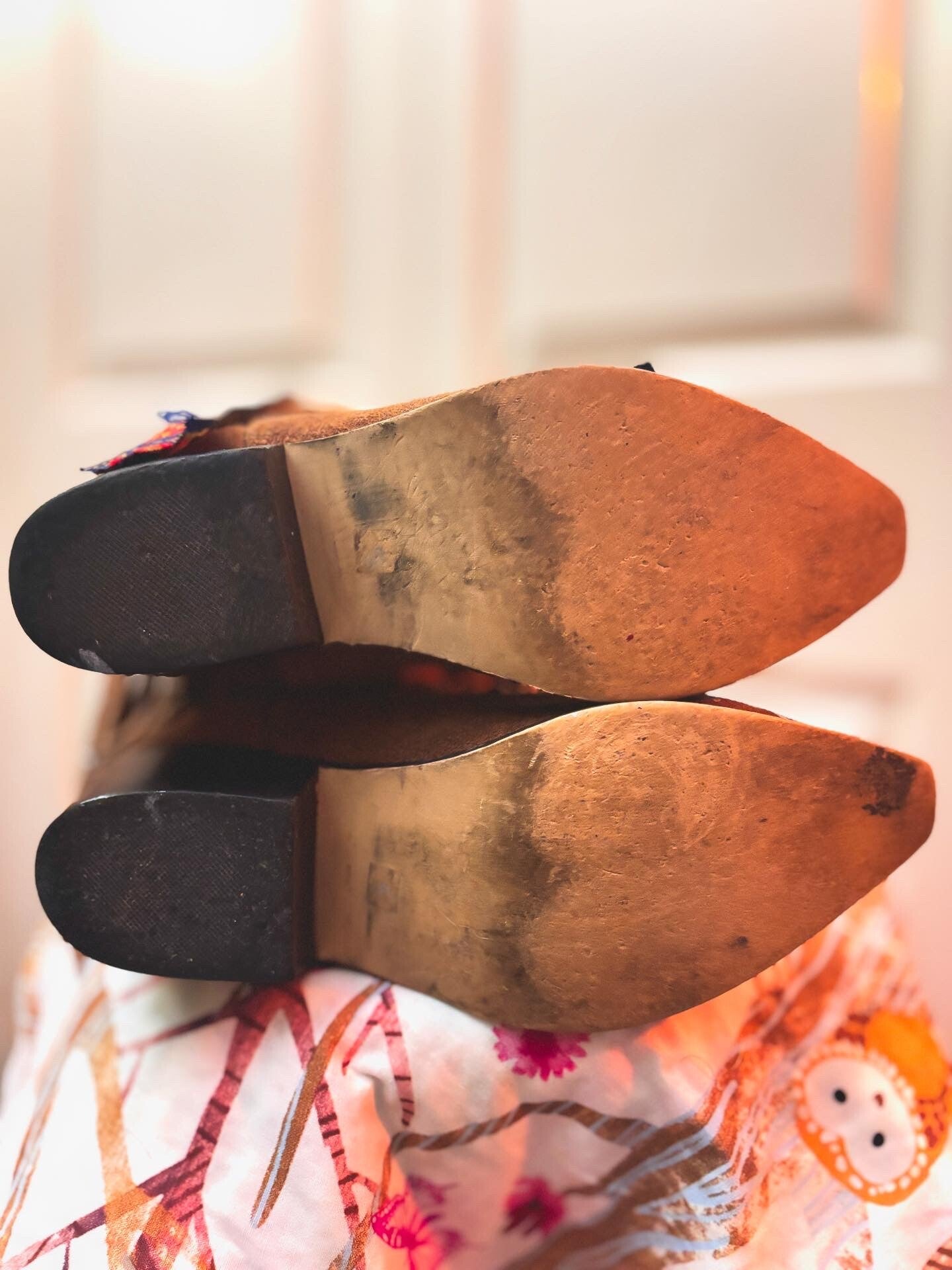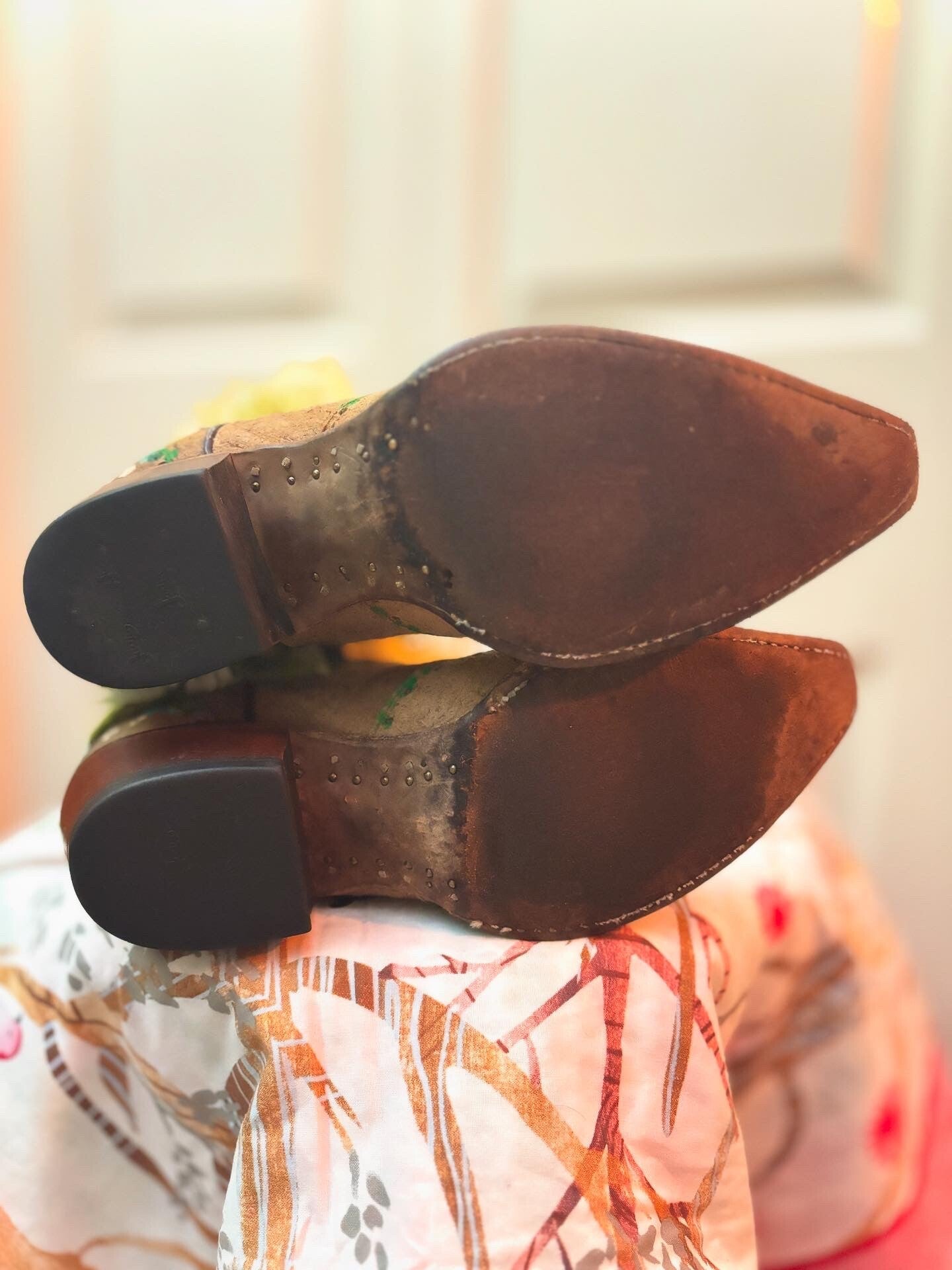 Tan Deer skin & bee charm boots: Size 8, 8.5 Featuring: Deer skin, charms, bee charms, floral yarn, & more. Hand decorated. Lightly worn, Up-cycled boots, brand(The Sanders Boot Makers) have been clean & treated with leather conditioners & protectants.