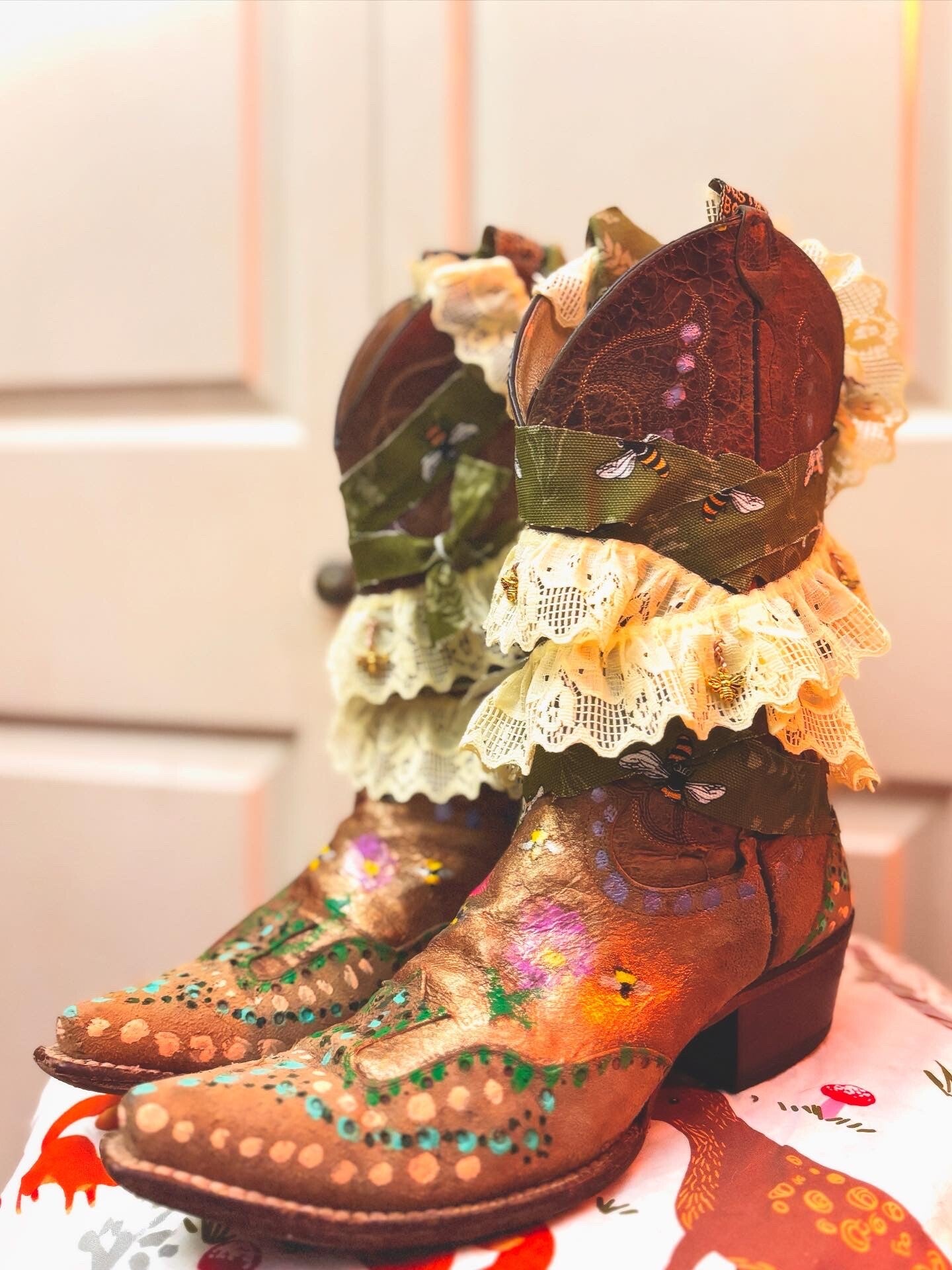 Country Bee Boots: Size 8. Hand painted up-cycled western boots. Feathring bee charms, lace, & more.