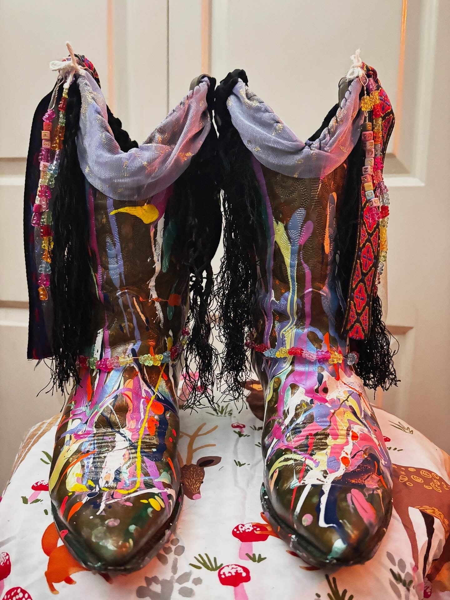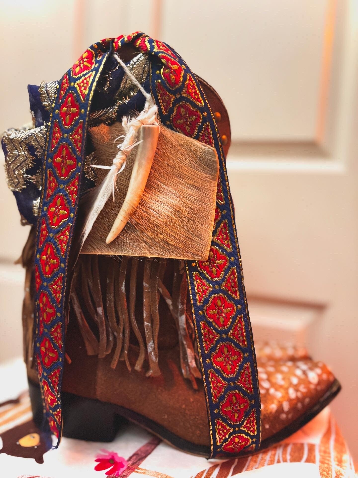The Ultimate Boho Boot: size 5. hand painted upcycled fringe leather western boots with acis deer skin, deer antler charms, & more.